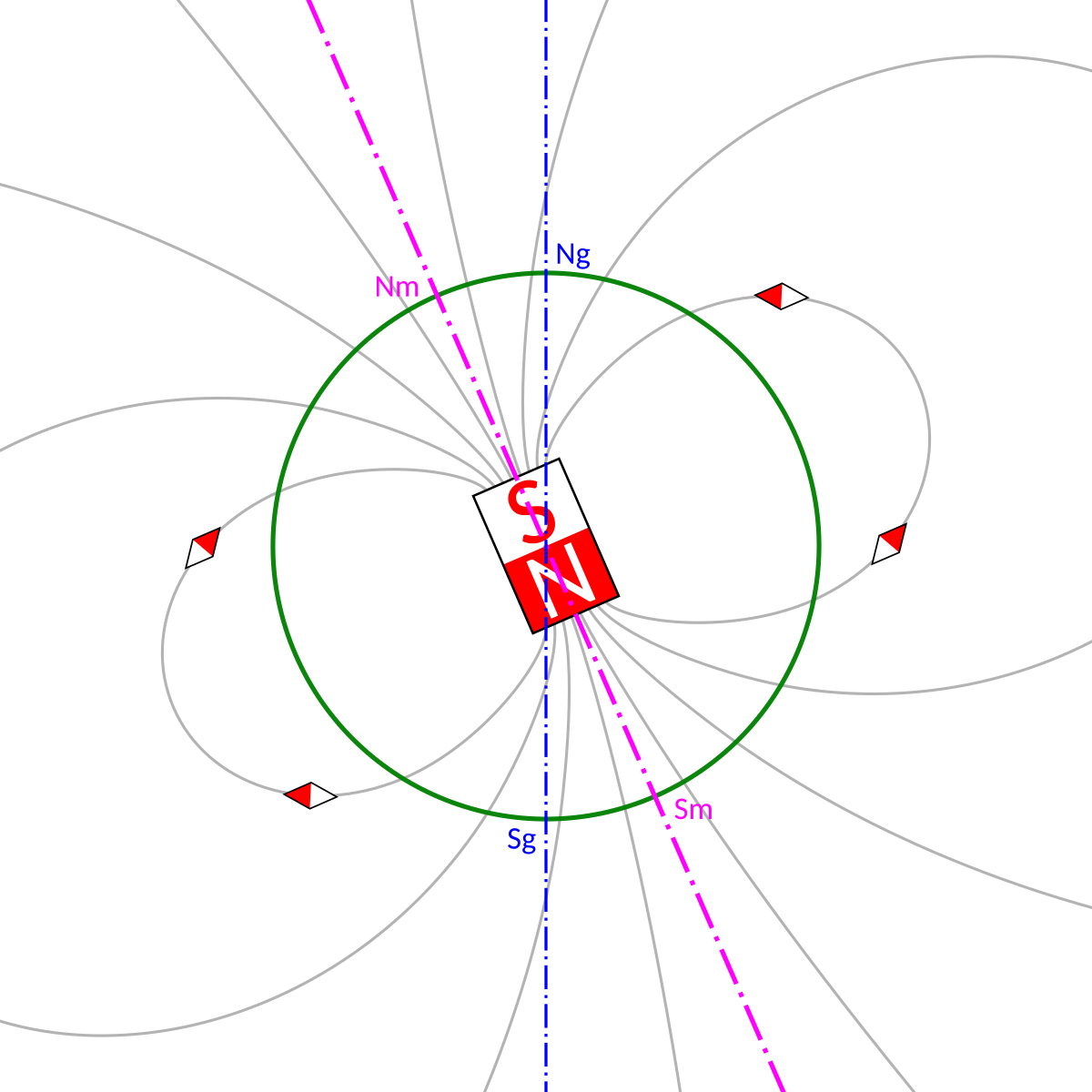 WN = Werkelijke Noordpool MN = Magnetische Noordpool
